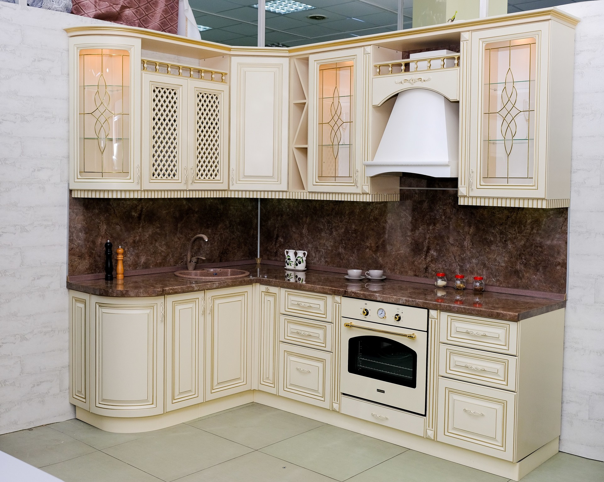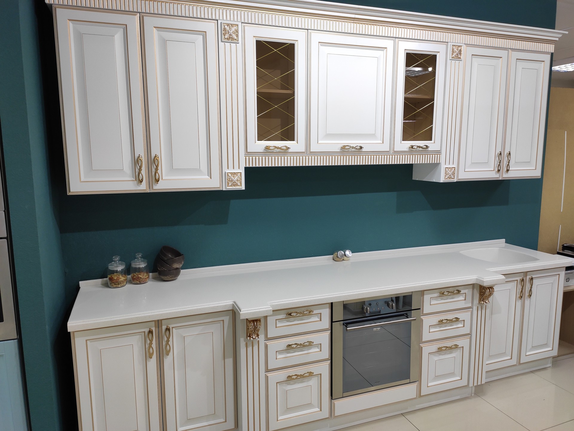 Кухонный гарнитур выполнен в классическом стиле и украшен изящным декором. Золотая патина на фасадах, паяные витражи подчеркивают изящный внешний вид. Большое рабочее простанство, функциональные выдвижные ящики, петли с плавным закрыванием.