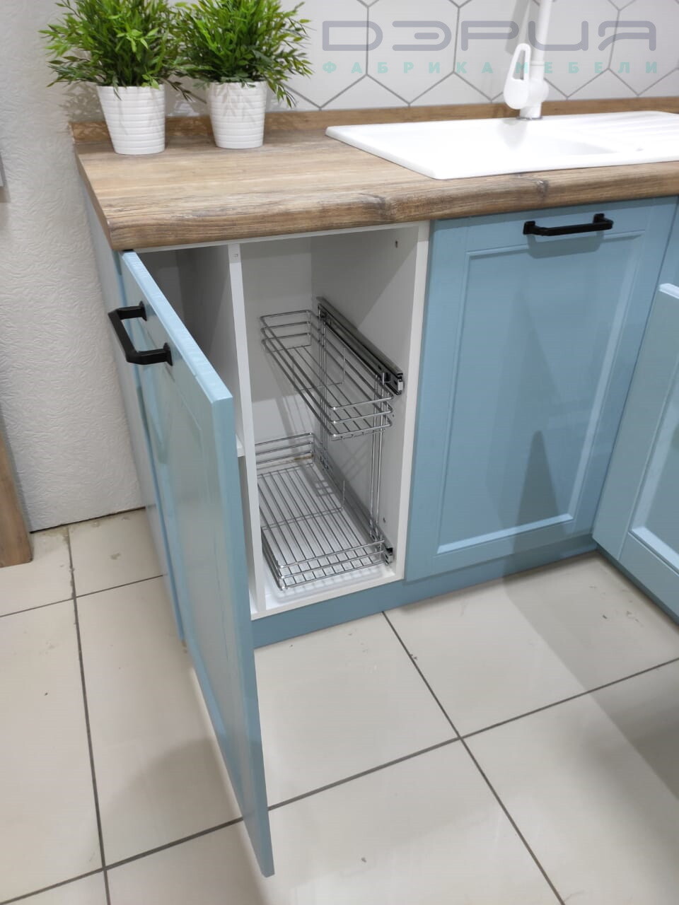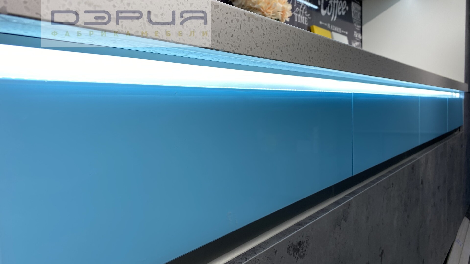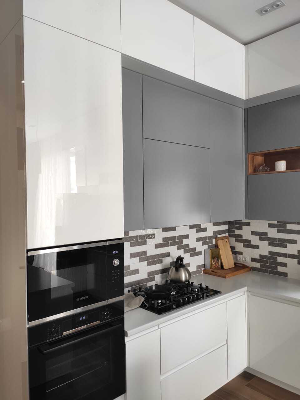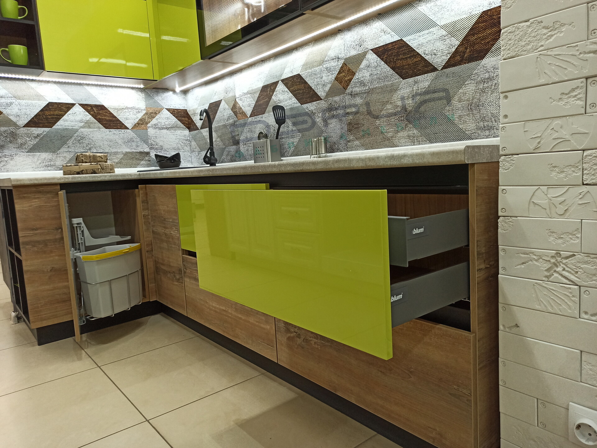 Ручки выкрашены в цвет фасадов – оставаясь практически незаметными, они гармонично вписываются в стиль кухни. Глянцевая поверхность имеет высокую степень гладкости фасада, с таких фасадов легко будет убирать все возникшие загрязнения. Фурнитура, в данном гарнитуре используется система полного выдвижения австрийского производителя Blum. Эта система исключает любой перекос ящика в процессе движения, а также отличается высокой нагрузочной стабильностью (до 50 кг), бесшумностью, плавностью открывания и закрывания.