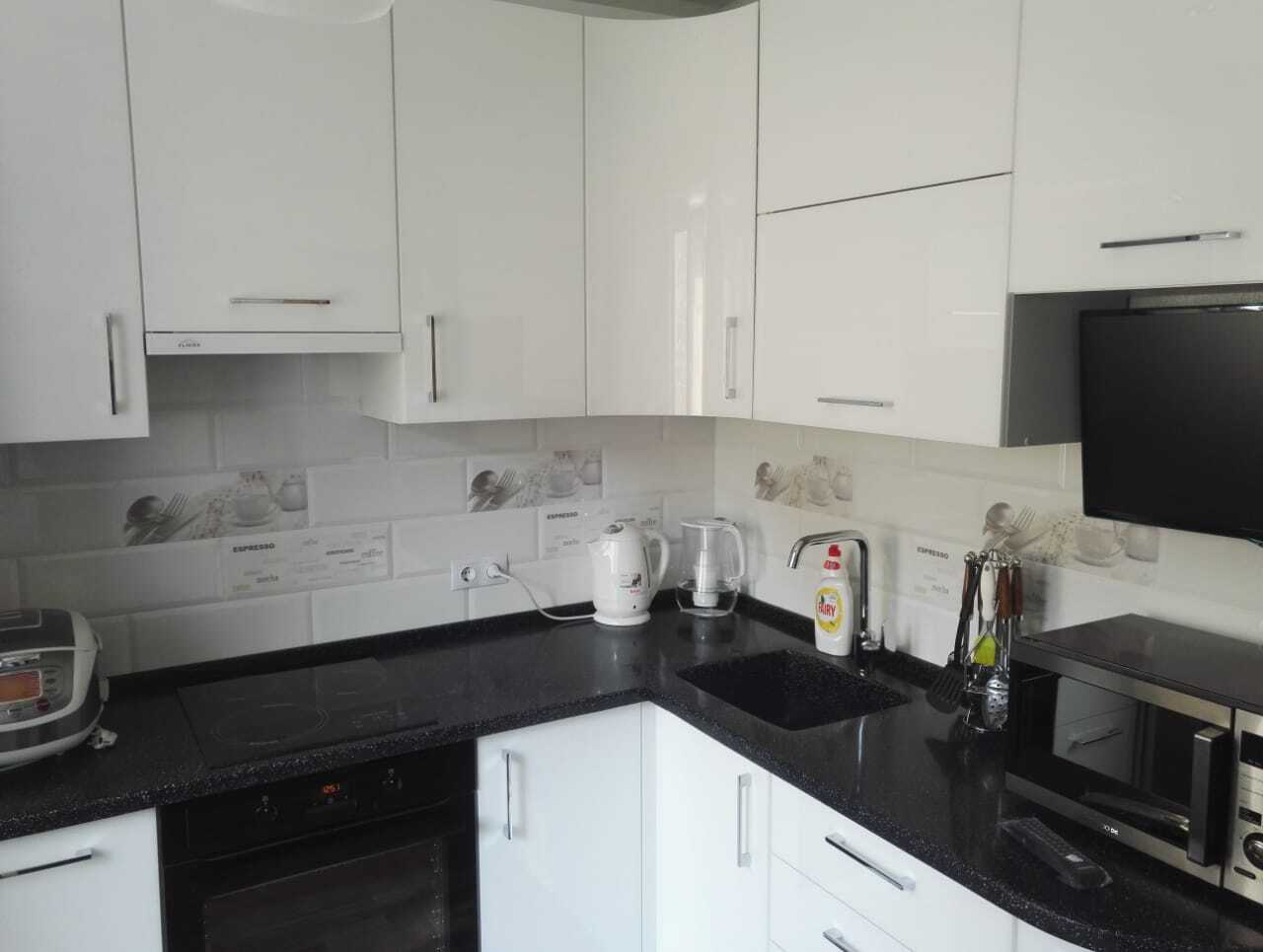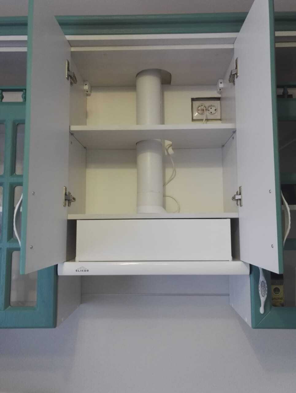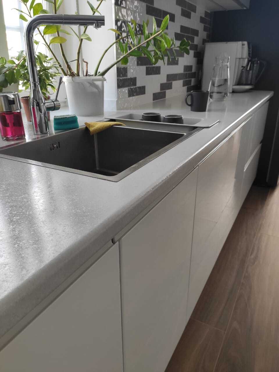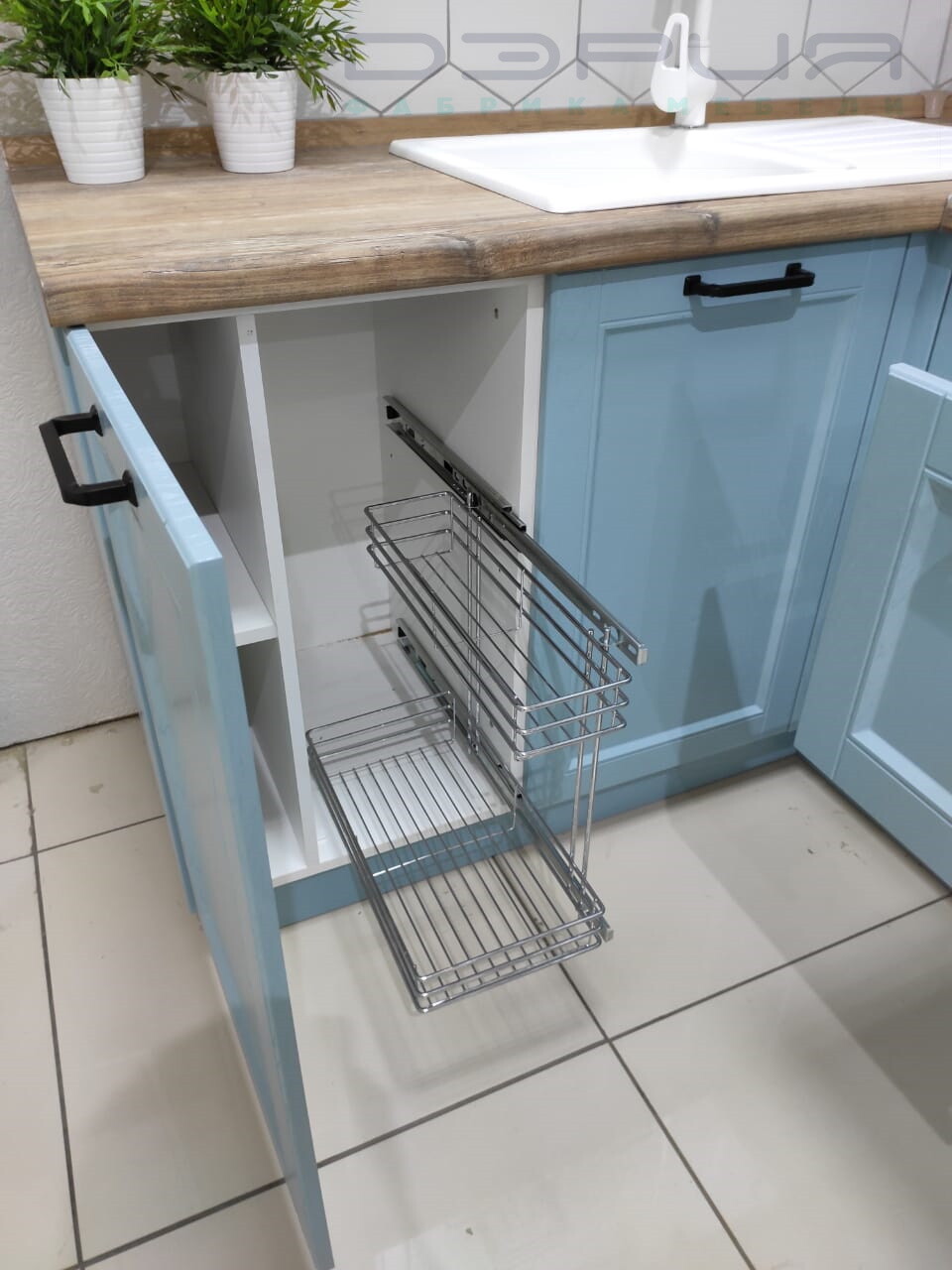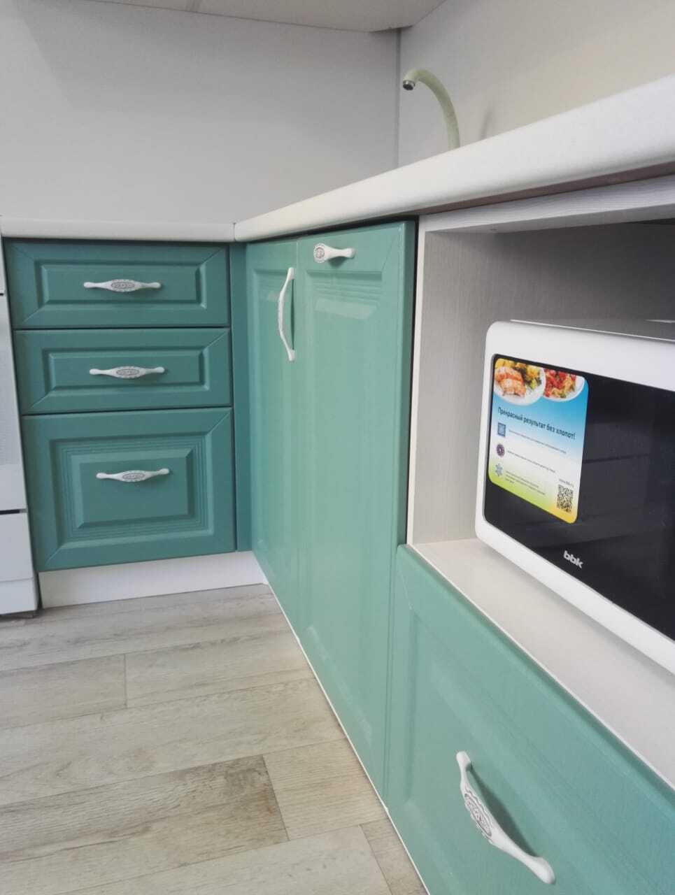 Ручки выкрашены в цвет фасадов – оставаясь практически незаметными, они гармонично вписываются в стиль кухни. Глянцевая поверхность имеет высокую степень гладкости фасада, с таких фасадов легко будет убирать все возникшие загрязнения. Фурнитура, в данном гарнитуре используется система полного выдвижения австрийского производителя Blum. Эта система исключает любой перекос ящика в процессе движения, а также отличается высокой нагрузочной стабильностью (до 50 кг), бесшумностью, плавностью открывания и закрывания.